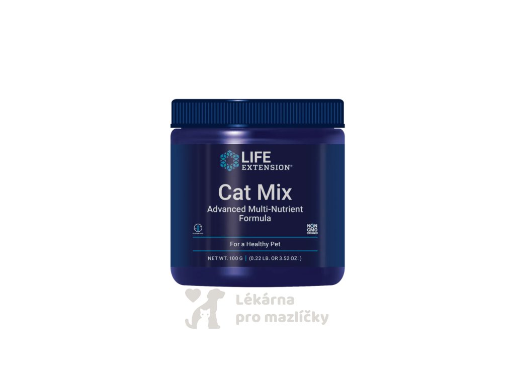Life Extension Cat Mix je výživový doplněk navržený v souladu s potřebami kočičího organismu. Obsahuje vysoce kvalitní živiny jako jsou vitamíny, animokyseliny, fytonutrienty - flavonoidy, antioxidanty, probiotika, esenciální mastné kyseliny a látky podporující buněčnou obnovu.